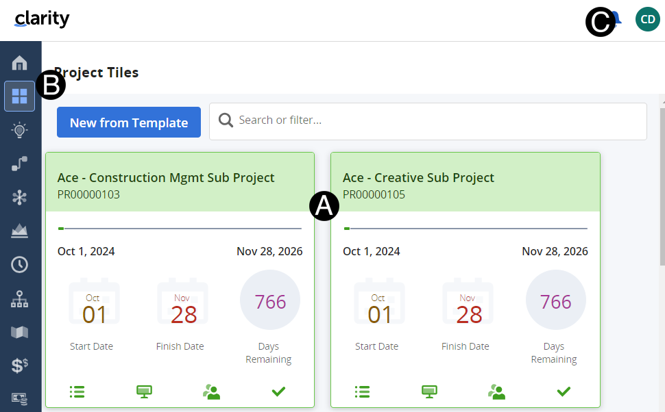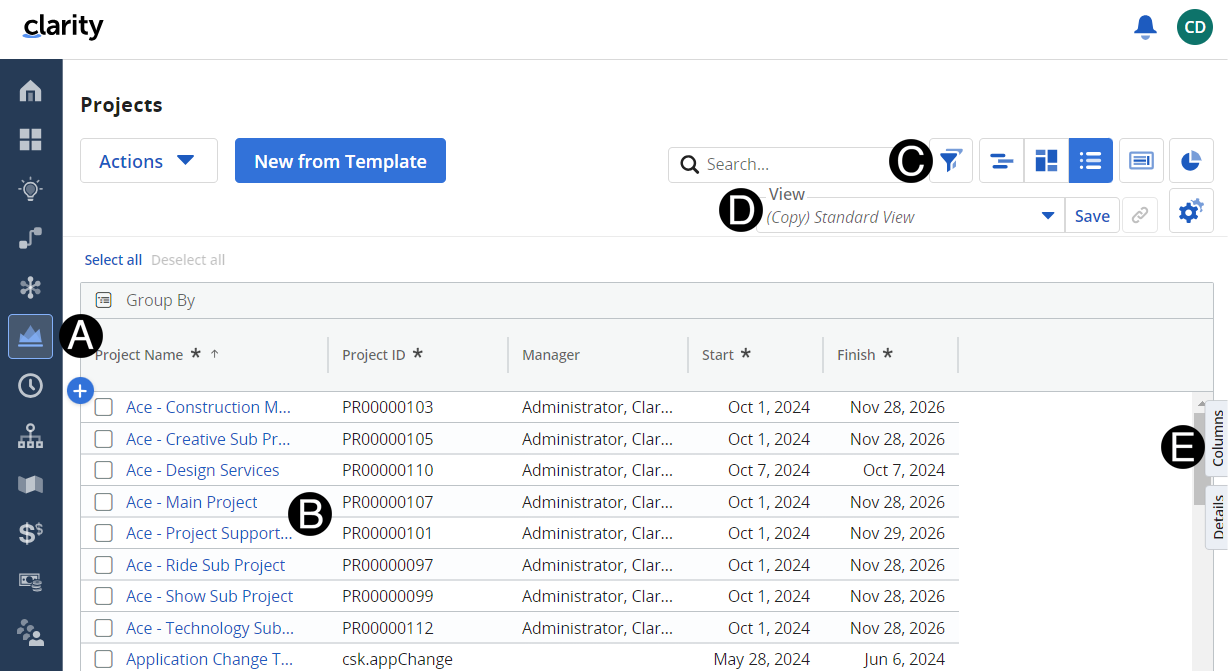 One of the common components in Clarity is the dynamic grid. You can find the grid throughout the application to manage projects, tasks and staffing.