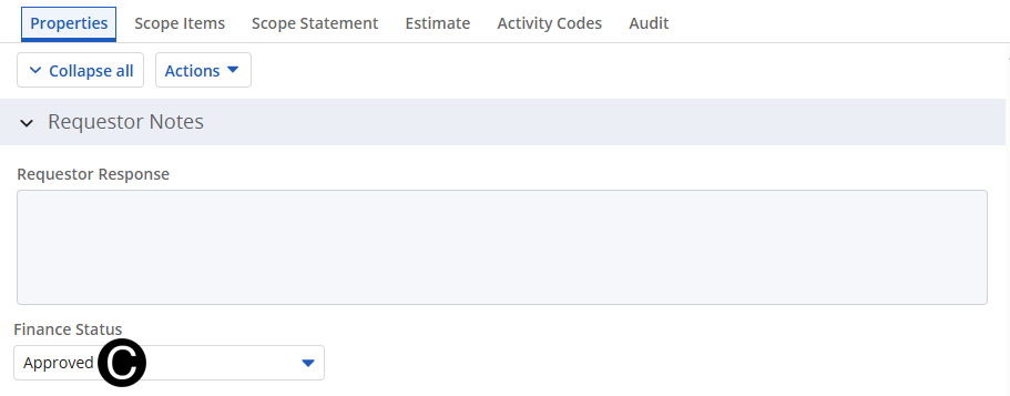 In Requestor Notes Section change Finance Status to Approved from drop-down list.