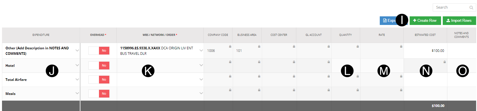 Select Expenditure from drop down that applies to this Travel Plan for reach newly created row.