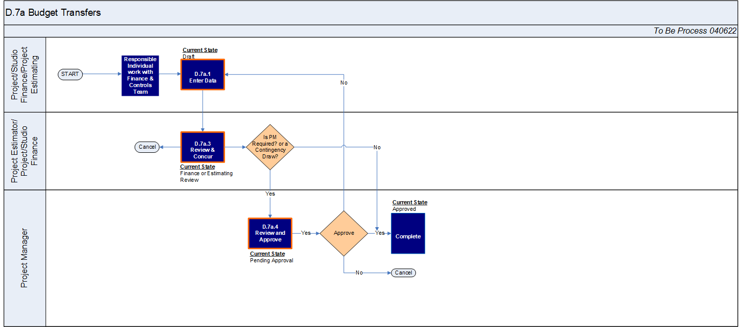 The Budget Transfers process enables the transfer of dollars within the Project Structure to align Budgets with how we are buying the scope of work. This process is used to transfer current budget which impacts the Estimated Final Cost (EFC).