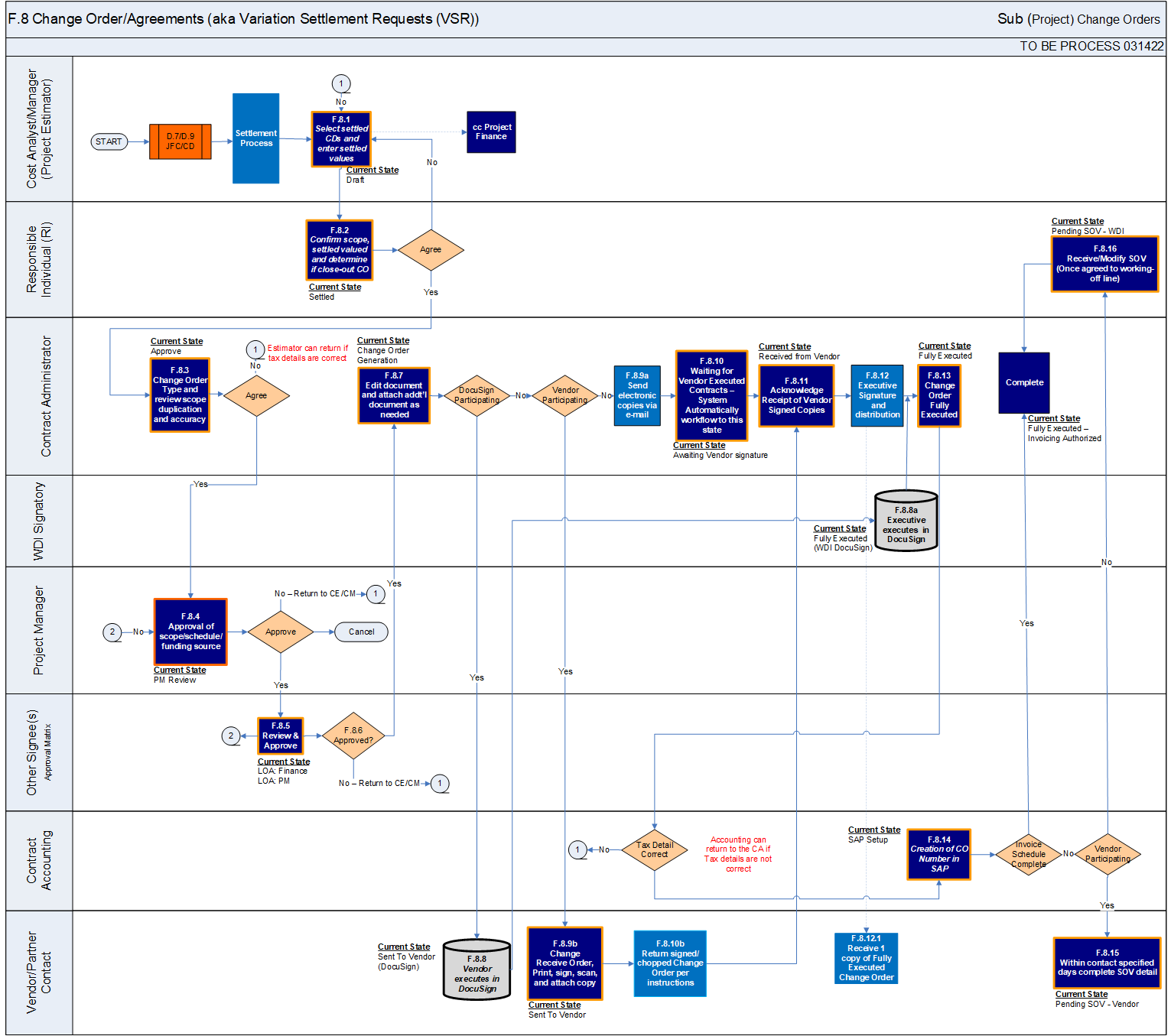 The Change Order process enables the Project Estimator to settle changes based on Contract Directives issued to the Vendor, proposal received and the settlement process complete