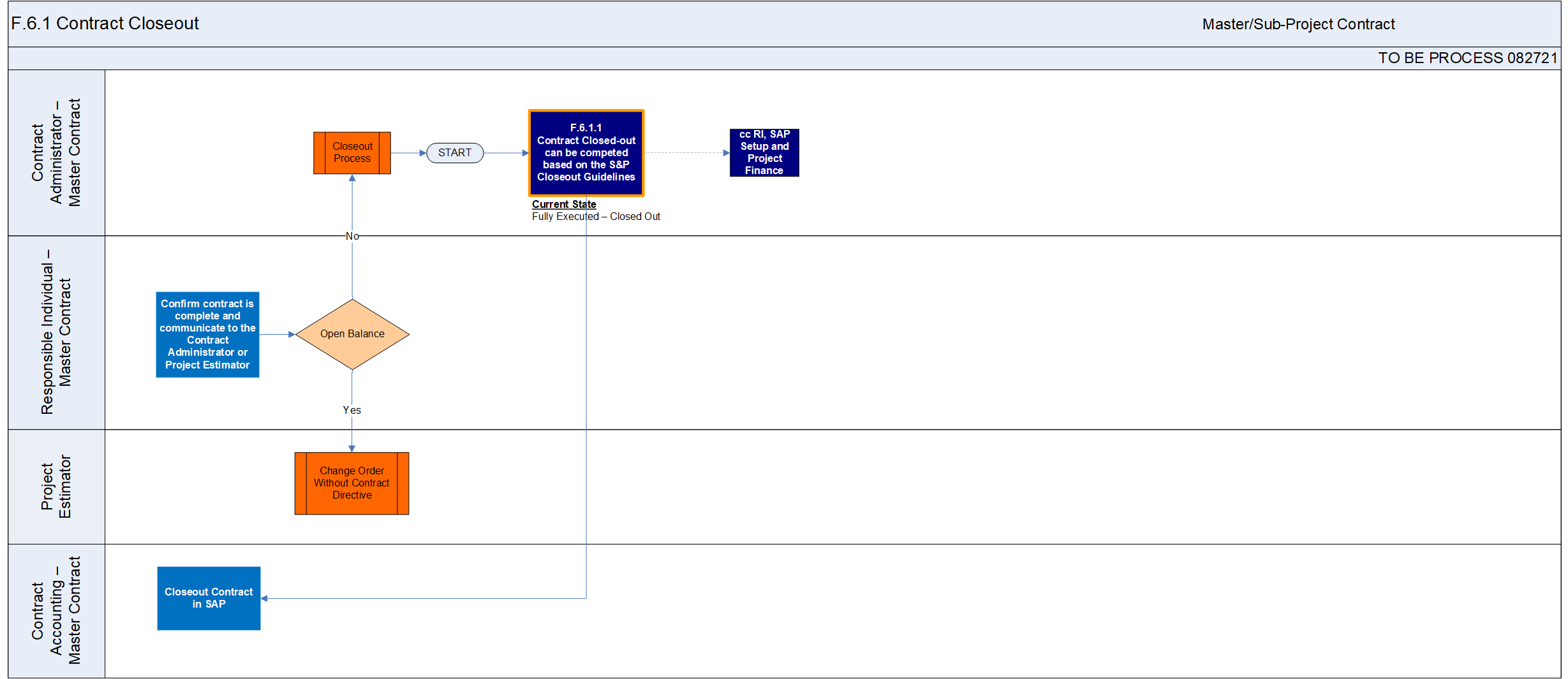 Contract Administrator manages the Contract Closeout Process once the Responsible Individual confirms there is not balance.